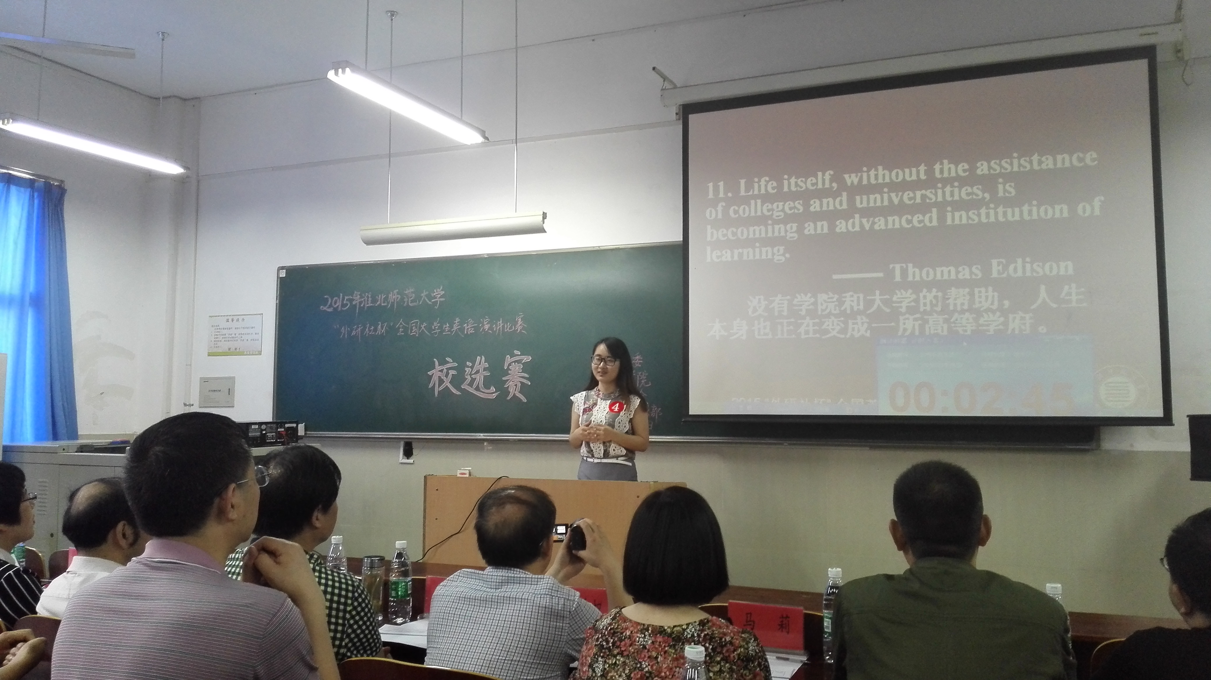 校选赛设英语专业组和非英语专业组,经过第一轮初赛,专业组和非专业组共有22名选手进入校选赛决赛。决赛分为两个环节,即三分钟即兴演讲和一分钟问答。选手提前20分钟抽签,就“He who keeps company with wolves learns to howl.”,“Heaven has endowed me with talents for eventual use.”,“Nothing in the world is difficult if you set your mind to it .” 等经典名言或热点话题进行3分钟即兴演讲,并就演讲内容和相关话题回答提问教师的问题。